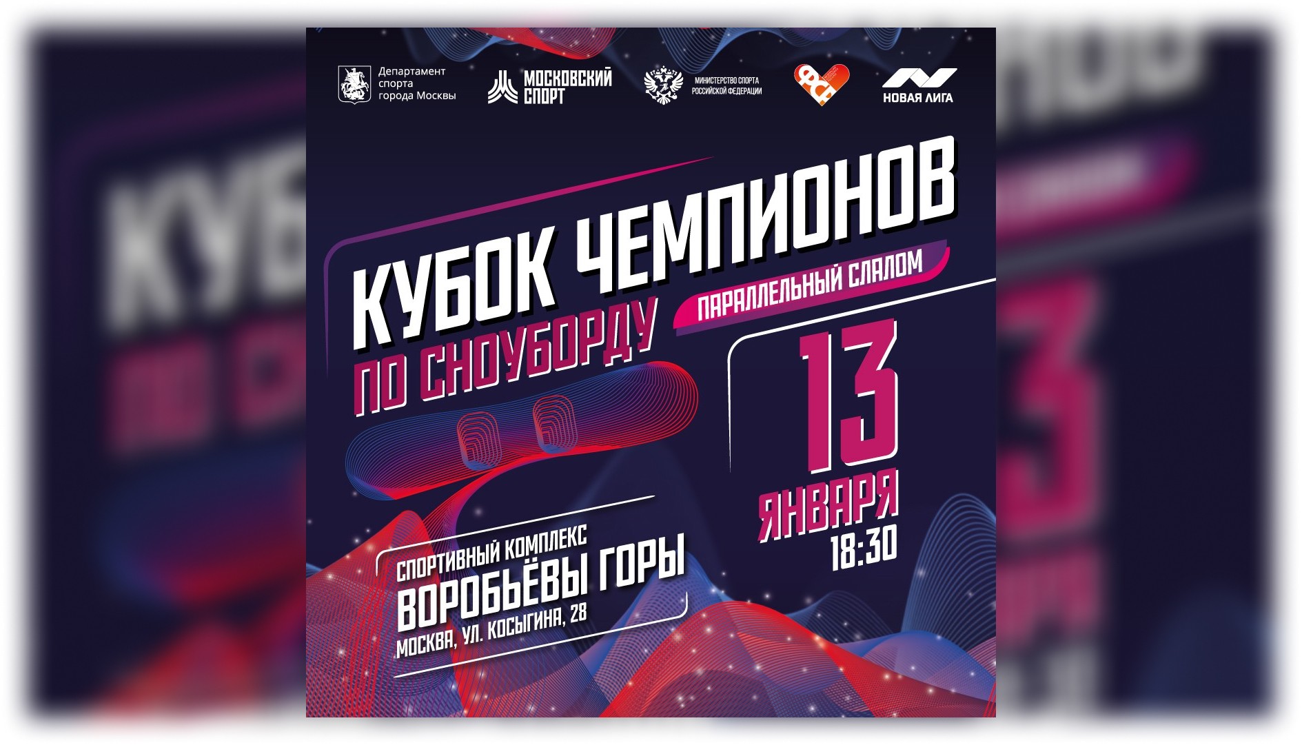 13 января 2024 года на территории спортивного комплекса «Воробьевы горы» состоится Кубок Чемпионов по сноуборду в дисциплине параллельный слалом. Соревнования соберут сильнейших российских сноубордистов, а также лучших спортсменов из Ирана, Казахстана и Японии.
