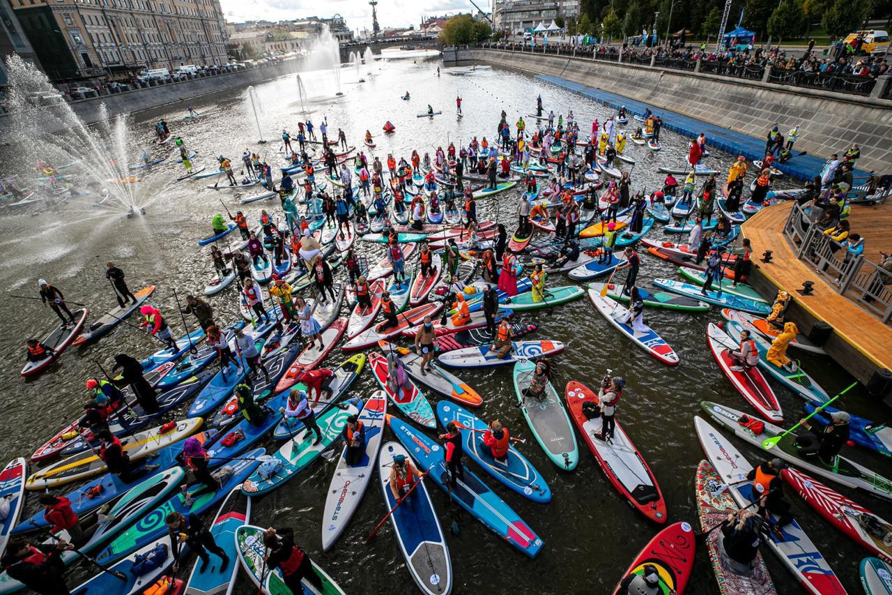 Почти 1000 сапсёрферов, фристайлисты-аквабайкеры и флайбордисты вышли на Водоотводный канал Москвы.